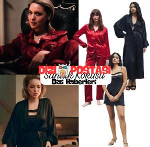 Sandık Kokusu Lale’nin son bölümde giymiş olduğu, Uzun Kollu Saten Pijama Takımı, Saten Siyah Uzun Sabahlığı ve Askılı Geceliği FEU DE ELU markasına ait olduğu bilgisine ulaşıldı.